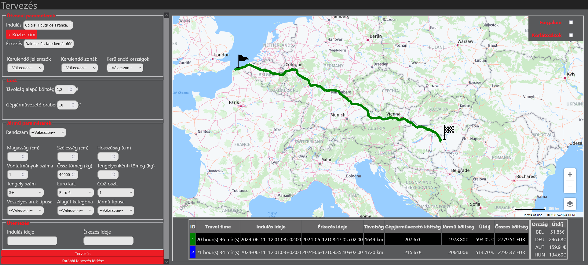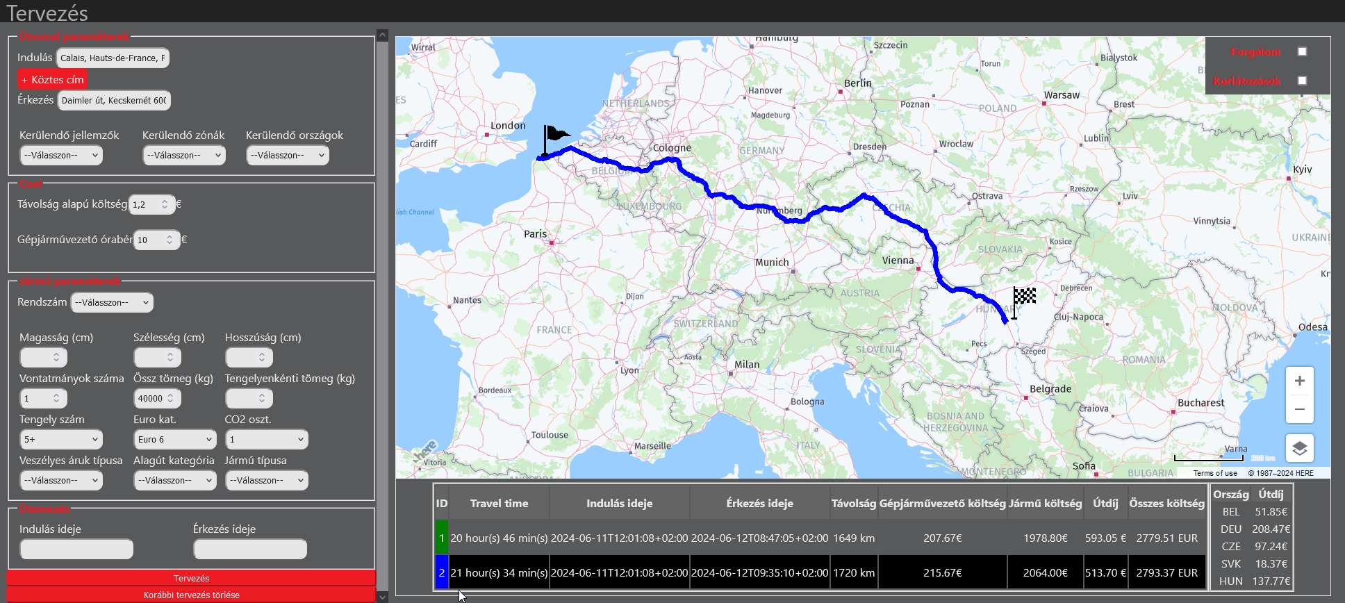 Ahhoz, hogy a kérdést megválaszoljuk, tervezzük meg az útvonalat úgy, hogy figyelembe vesszük a távolság alapú költséget, legyen 1,2 €/km és a gépjárművezető óradíját: 10€/óra. Amikor ezeket a költségeket nem vettük figyelembe, egyértelmű volt, hogy a cseh irány a jó választás, mert CZ fele 514,4€, AT fele 593,05€ az útdíj erre a járműtípusra. Ugyanakkor, ha figyelembe vesszük, hogy a CZ irány 1720 km, az 1649 km-hez képest és a tervezett útvonal időtartama közel egy órával több (dugók nélkül), az eredmény másképp alakul. Ezt a program pillanatok alatt bizonyítja is: AT fele a teljes költség: 2779,5€ mig CZ fele: 2793,37€.